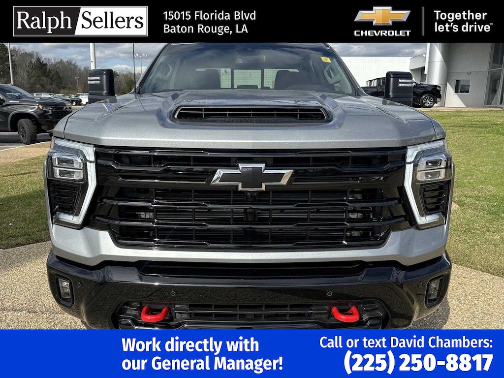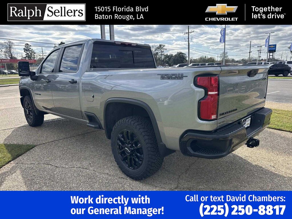 ENGINE, DURAMAX 6.6L TURBO-DIESEL V8 B20-Diesel compatible, (470 hp [350.5 kW] @ 2800 rpm, 975 lb-ft of torque [1322 Nm] @ 1600 rpm), TRAIL BOSS PACKAGE Includes black grille bar with Chevy Black Bow Tie, Black grille inserts, (SRI) 20 High gloss Black painted wheels, (VB5) High Gloss Black painted front bumper, (VT5) High Gloss Black painted rear bumper, (UGA) Red Tow Hooks, (QFG) LT275/65R20 BF Goodrich off-road tires, Black skid plate, Black badging, Black bowtie on horn pad, (DP6) High Gloss Black mirror caps, Black hood vent surround, High Gloss Black door handles and (CGN) Chevytec spray-on bedliner. Includes high-intensity LED headlamps and (DWI) trailer mirrors. SAFETY PACKAGE includes (UD5) Front and Rear Park Assist, (UKV) Trailer Side Blind Zone Alert, (UFG) Rear Cross Traffic Alert, (UV2) HD Surround Vision, (UVN) Bed View Camera and (TRG) Trailer Camera Provisions (Includes (UET) Trailering App. CONVENIENCE PACKAGE includes (UF2) Cargo bed LED lighting, (CJ2) dual-zone automatic climate control, (A2X) 10-way power driver seat including power lumbar, (N37) manual tilt/telescoping steering column, (T3U) LED fog lamps, SEATS, FRONT BUCKET with center console, for Crew Cab and Double Cab models, CONVENIENCE PACKAGE II includes (PZ8) Hitch Guidance with Hitch View, (UET) Trailering App, (A48) rear sliding power window and (UG1) Universal Home Remote. Includes (R7O) Cloth Rear Seat with Storage Package. REMOTE START PACKAGE includes (BTV) Remote Start, (UTJ) Theft Deterrent System and (C49) rear-window defogger, Z71 OFF-ROAD PACKAGE includes (Z71) Off-Road suspension with off-road tuned twin tube Rancho shocks, (JHD) Hill Descent Control and (NZZ) skid plates (transfer case and oil pan) (Includes (QXT) LT265/70R17 all-terrain, blackwall tires and molded in color Black grille. MIRRORS, OUTSIDE POWER-ADJUSTABLE VERTICAL TRAILERING WITH HEATED AND AUTO-DIMMING UPPER GLASS lower convex mirrors, turn signal indicators, puddle lamps, (U12) perimeter lighting, auxiliary lighting, power folding/manual extending (extends 3.31 [84.25mm]) Includes (DD8) auto-dimming rearview mirror which can be upgraded to (DRZ) Rear Camera Mirror.), HEAT PACKAGE includes (KA1) Heated driver and passenger seats and (KI3) Heated steering wheel, LPO, ALL-WEATHER FLOOR LINERS 1st and 2nd rows, (includes Z71 logo on front mats), AUDIO SYSTEM, CHEVROLET INFOTAINMENT 3 PREMIUM SYSTEM with Google built-in compatibility (select service plan required, terms and limitations apply) including navigation capability, 13.4 diagonal HD color touchscreen, includes multi-touch display, AM/FM stereo, Bluetooth® streaming audio for music and most phones; featuring Wireless Apple CarPlay® and Wireless Android Auto® capability for compatible phones, advanced voice recognition, in-vehicle apps, personalized profiles for infotainment and vehicle settings (STD), TRANSMISSION, 10-SPEED AUTOMATIC, SEAT, UP-LEVEL REAR WITH STORAGE PACKAGE 60/40 Split rear seat with center armrest, right, and left seat back storage, and under seat jack storage (Crew Cabs Only) Rear seat leather appointed.